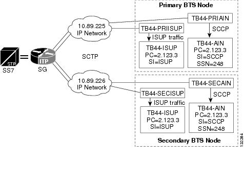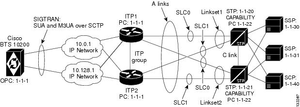 The IETF SIGTRAN standard defines how a signaling gateway, such as the Cisco ITP, routes traffic from the Signaling System 7 (SS7) service provider towards a SIGTRAN enabled IP endpoint, such as the Cisco BTS 10200 Softswitch. This section provides a basic example and diagram for configuring an application server (AS) and application server process (ASP) on the ITP. Please refer to Figure 2-3 when reading this example.