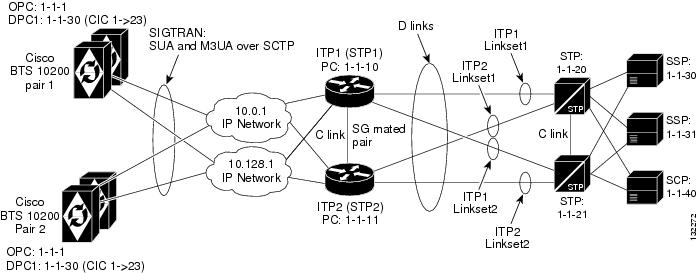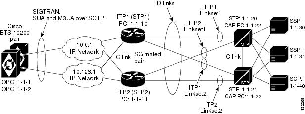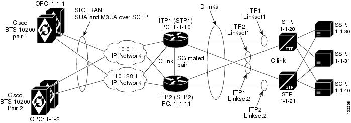 A pair of high capacity Cisco 73XX or 7507 series ITP nodes are required to provide the necessary throughput. The topology between ITPs and Signal Transfer Point (STPs) forms a typical Signaling System 7 (SS7) STP quad. Global title translation (GTT) is supported on the Cisco ITP.