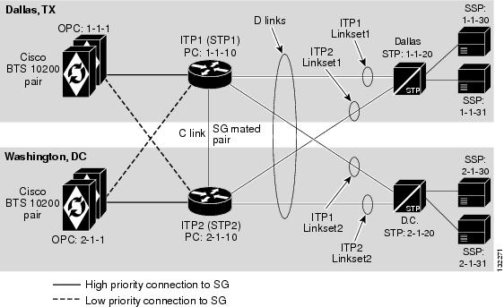 A key component of this profile is the use of SG priority routing, which provides the ability to choose which SG in the SG-Group has priority when sending towards the destinations. In this example, BTS1 will primarily send toward the DPCs (Switching Systems Protocol [SSP]) in the Dallas network via ITP1, and it will only route through ITP2 for these endpoints at a lower priority. This is useful for cost reduction if, for example, BTS1 has a point of presence (POP) in Dallas and BTS2 has a POP in Washington, DC.