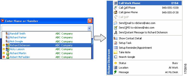 Right-click to auto-dial, access telephony features, or send messages.