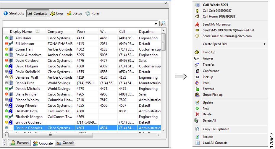 Cisco Unified CallConnector supports three contact databases — a Corporate database for shared organization contact information, a Personal database that is available for each individual user, and the Outlook contacts. The Contacts view (shown below) allows you to search, view, and manage this information. You can also right-click to access the Actions menu for each contact, as shown below.