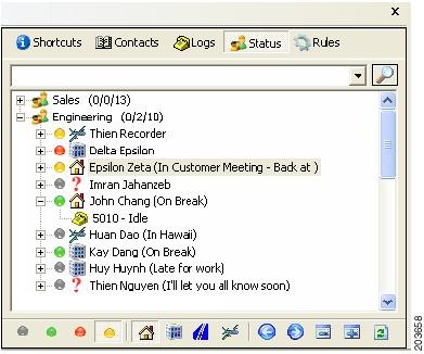 The Cisco Unified CallConnector Status view provides a real-time view of the entire organization and has information on the availability of users and groups, the location of people, and the status of each extension. Users can manage their own presence status, make calls, and send QuickMessages from this view, as shown in the following example.