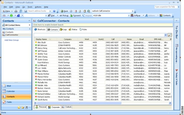The Cisco Unified CallConnector toolbar runs within Internet Explorer and Outlook and provides unified one-click access to tools that enable you to control calls, quickly locate your contacts, send messages, and start collaboration sessions. Click the Contacts button to view information about your contacts, call logs, or the presence status of your colleagues.