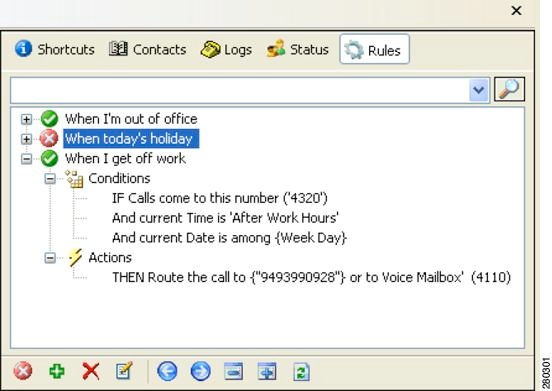 Rules — Allows you to specify automated routing and notification of calls. You must have the Cisco Unified CallConnector Mobility Service installed to use rules.
