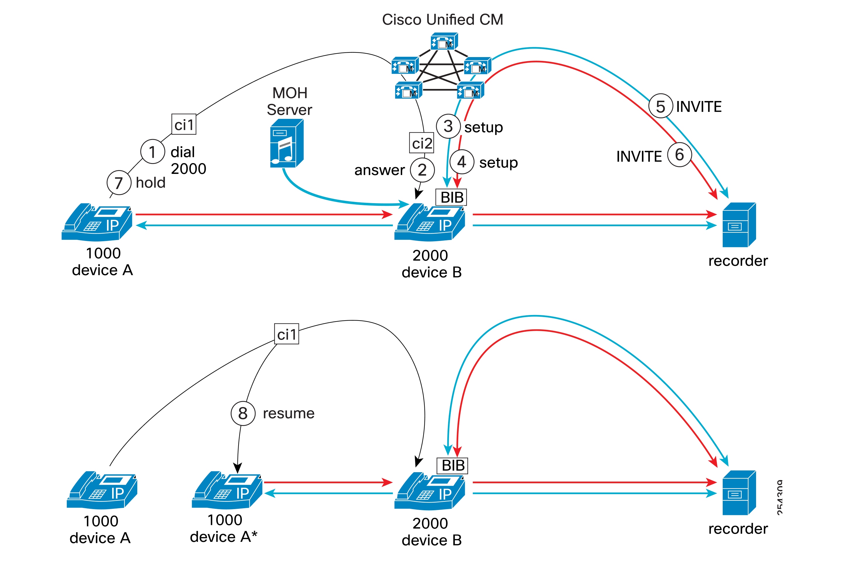 - 1–3. A call is in progress and the gateway is recording the media. User 1 places the call on hold. Cisco Unified Communications Manager plays Music-on-Hold to the caller.