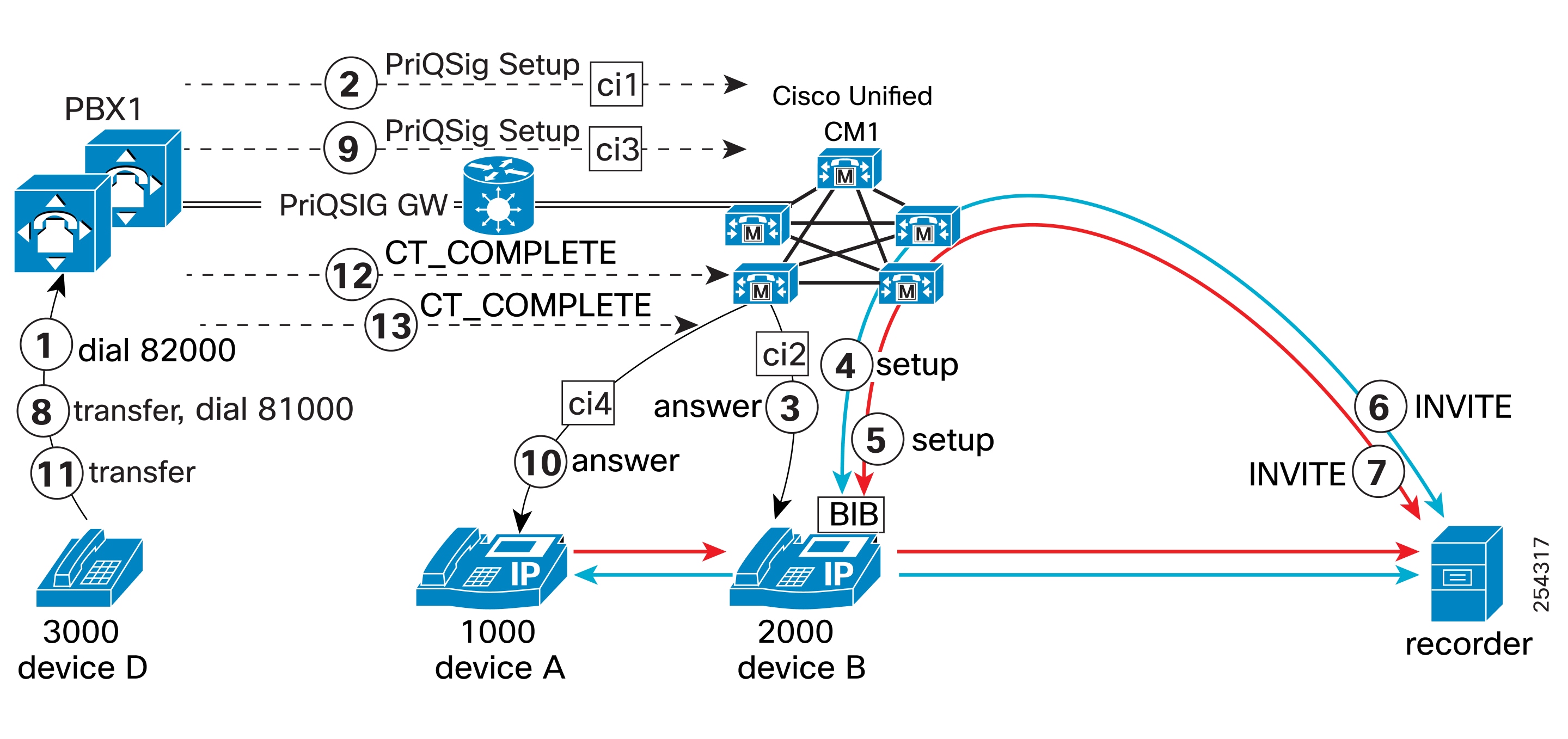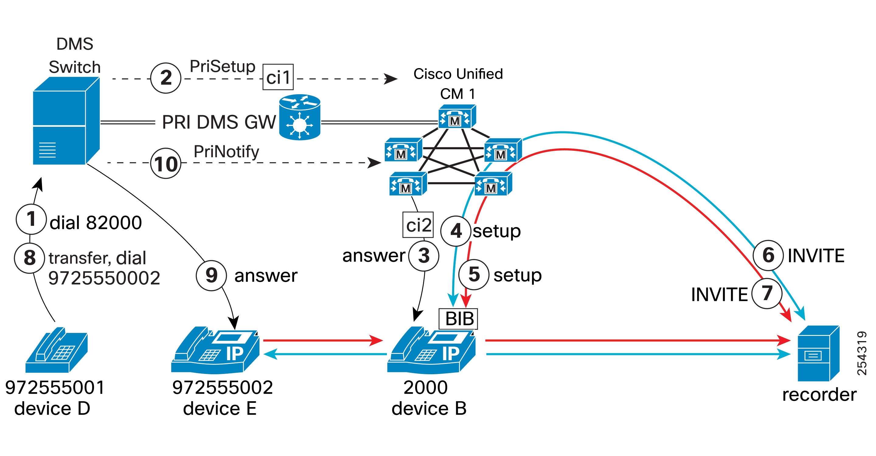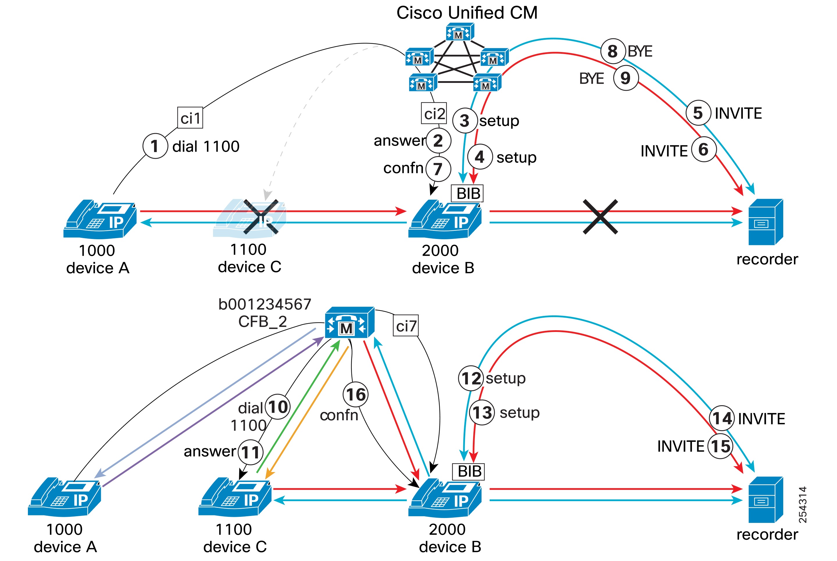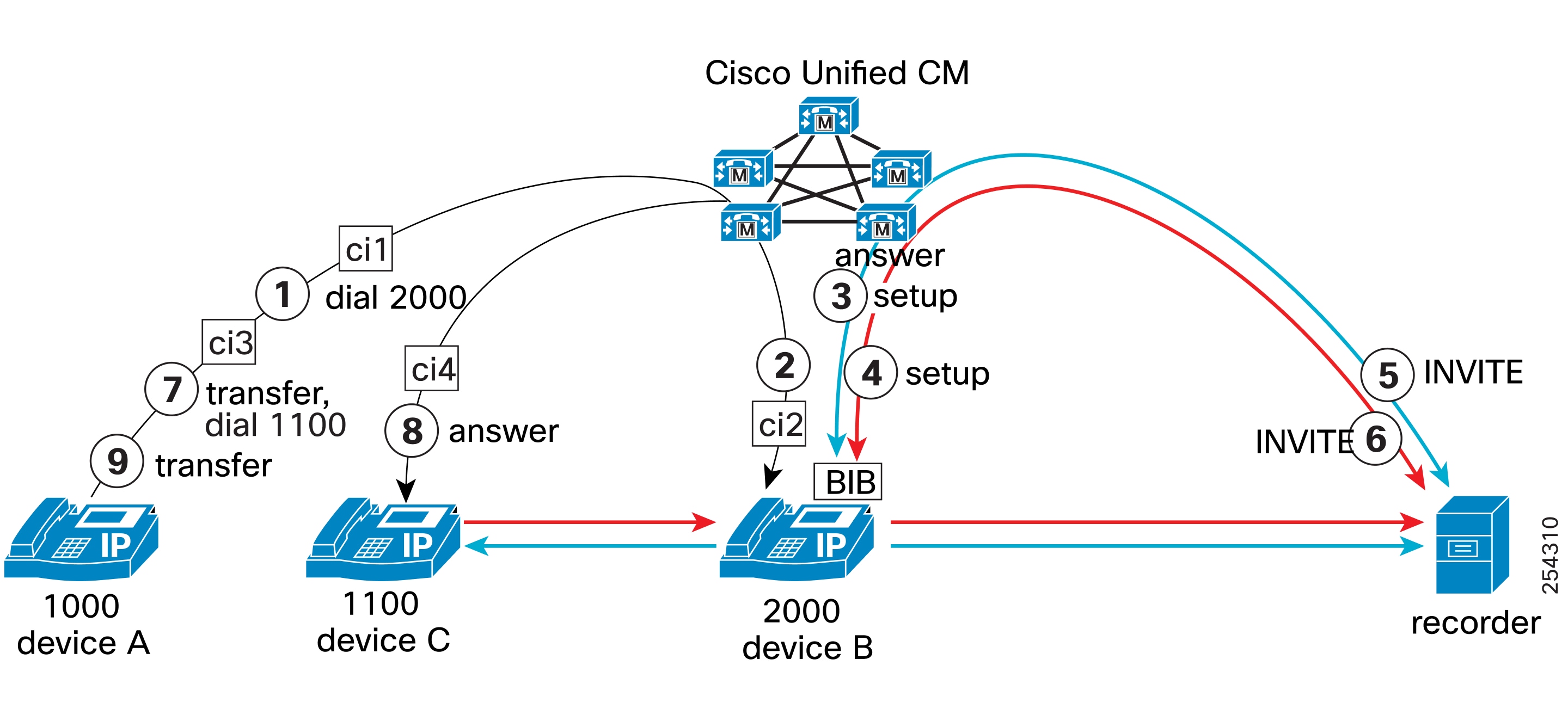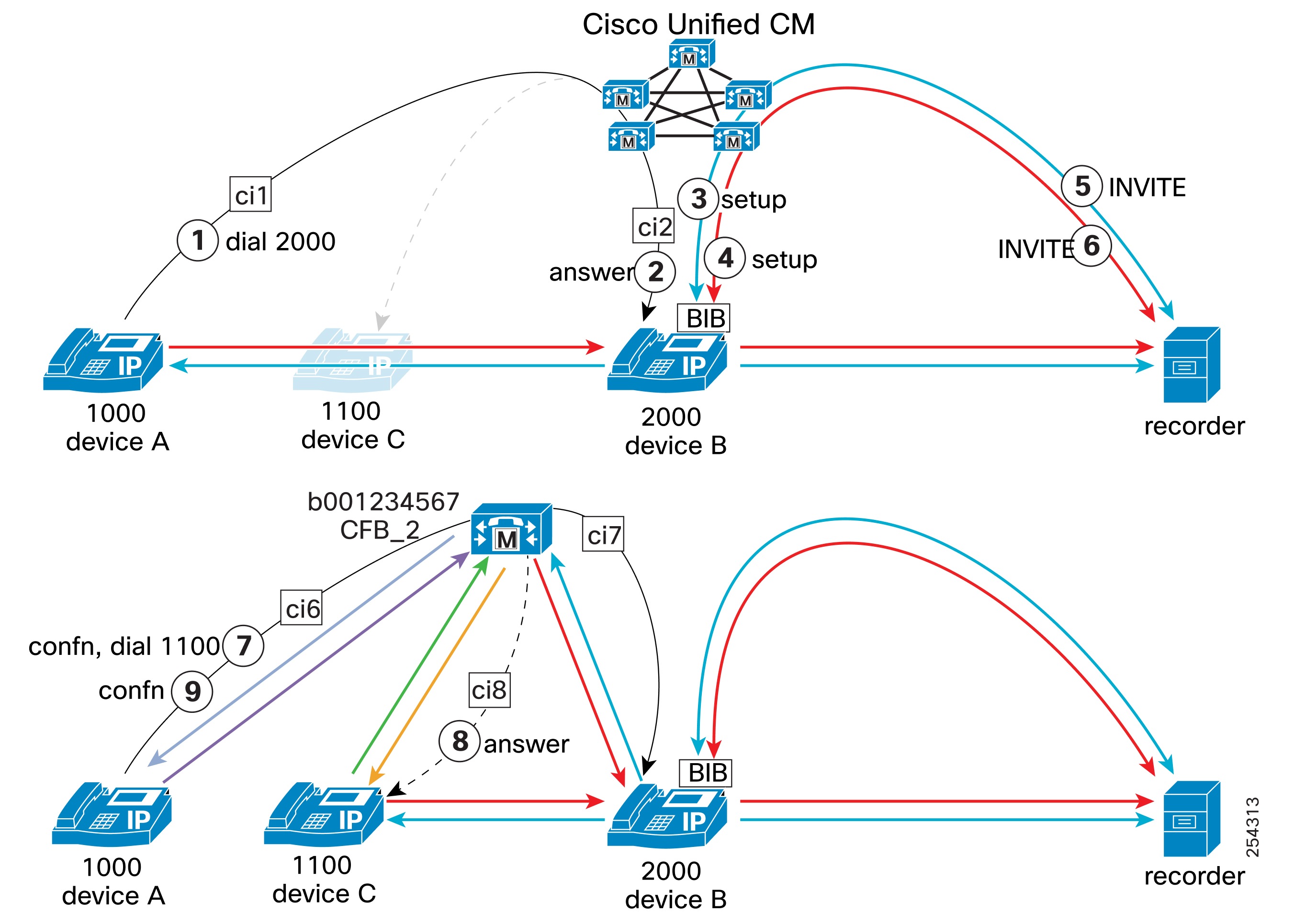 The user presses the Record key to start the recording session. Cisco Unified Communications Manager makes two recording calls to the built-in bridge (BIB) of the Cisco IP device (one call for the near-end media; another call for the far-end media). The recording calls are automatically and silently answered.