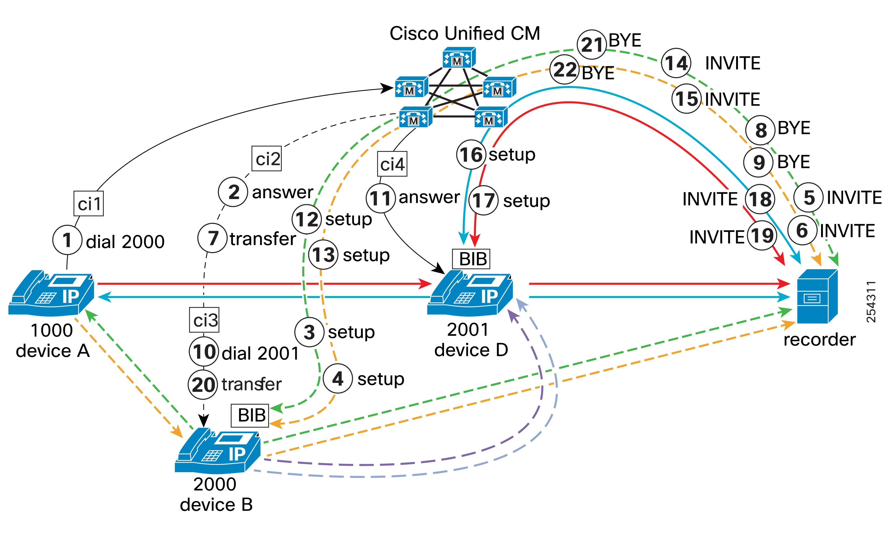 Cisco Unified Communications Manager extends both recording calls to the recording server connected by a SIP trunk.