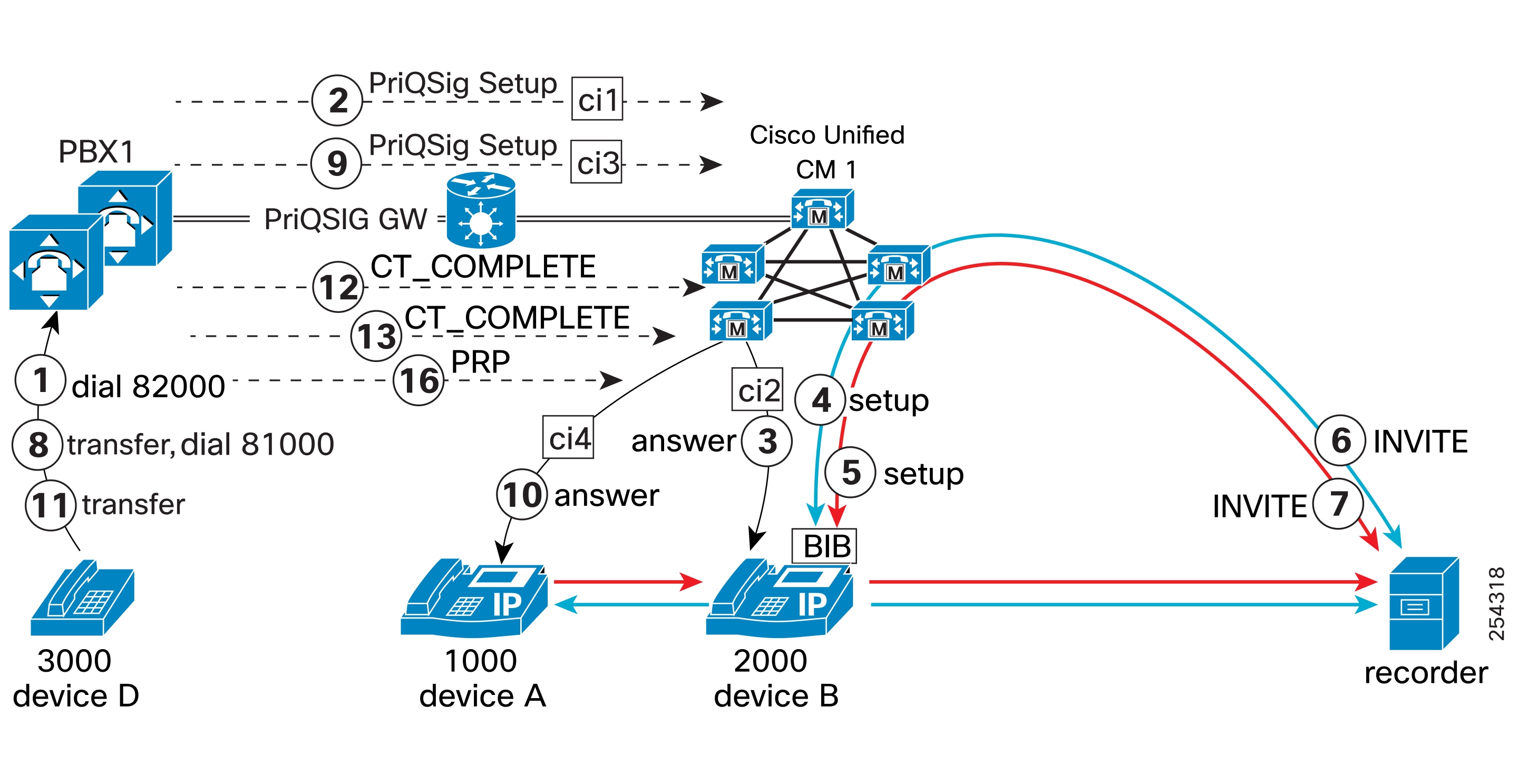 - 4–5. Two recording sessions are started automatically from both IP phones. The recording media source for both phones is Gateway Preferred. Since the gateway is not in the call flow Cisco Unified Communications Manager selects the IP Phones to fork the media to the recorder.