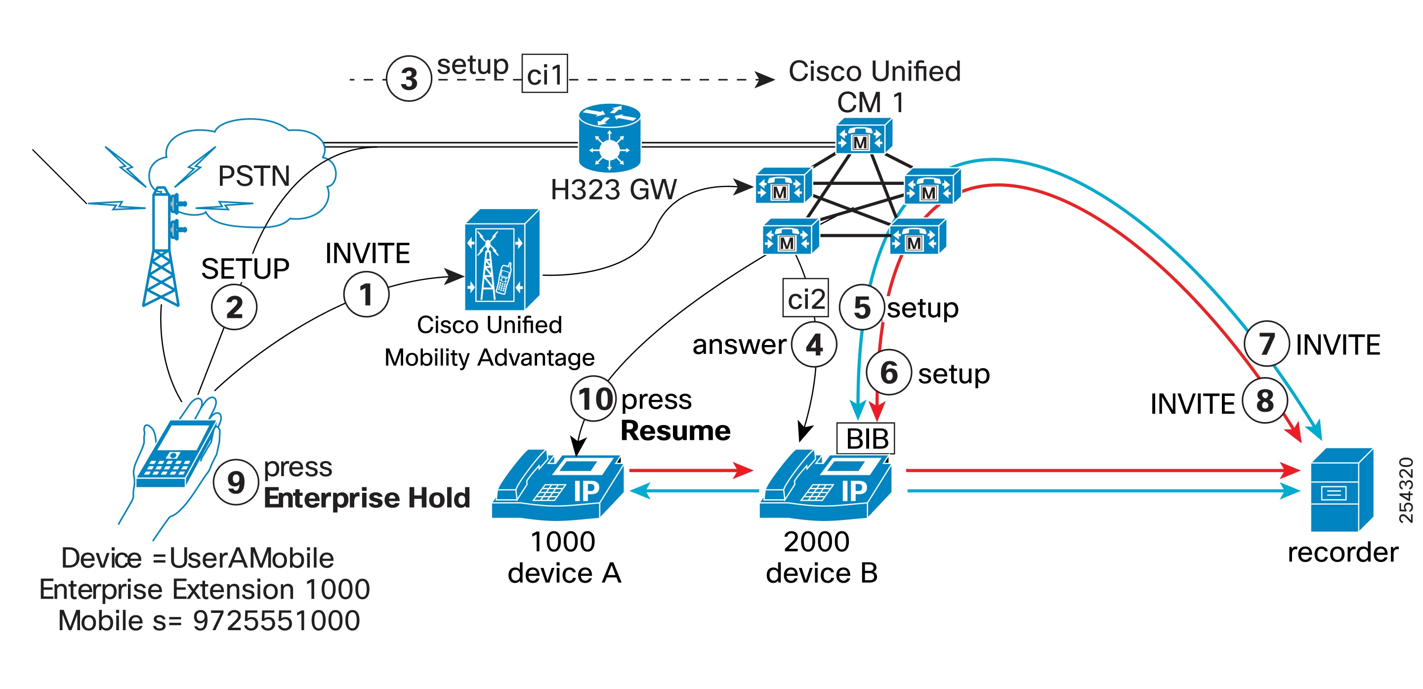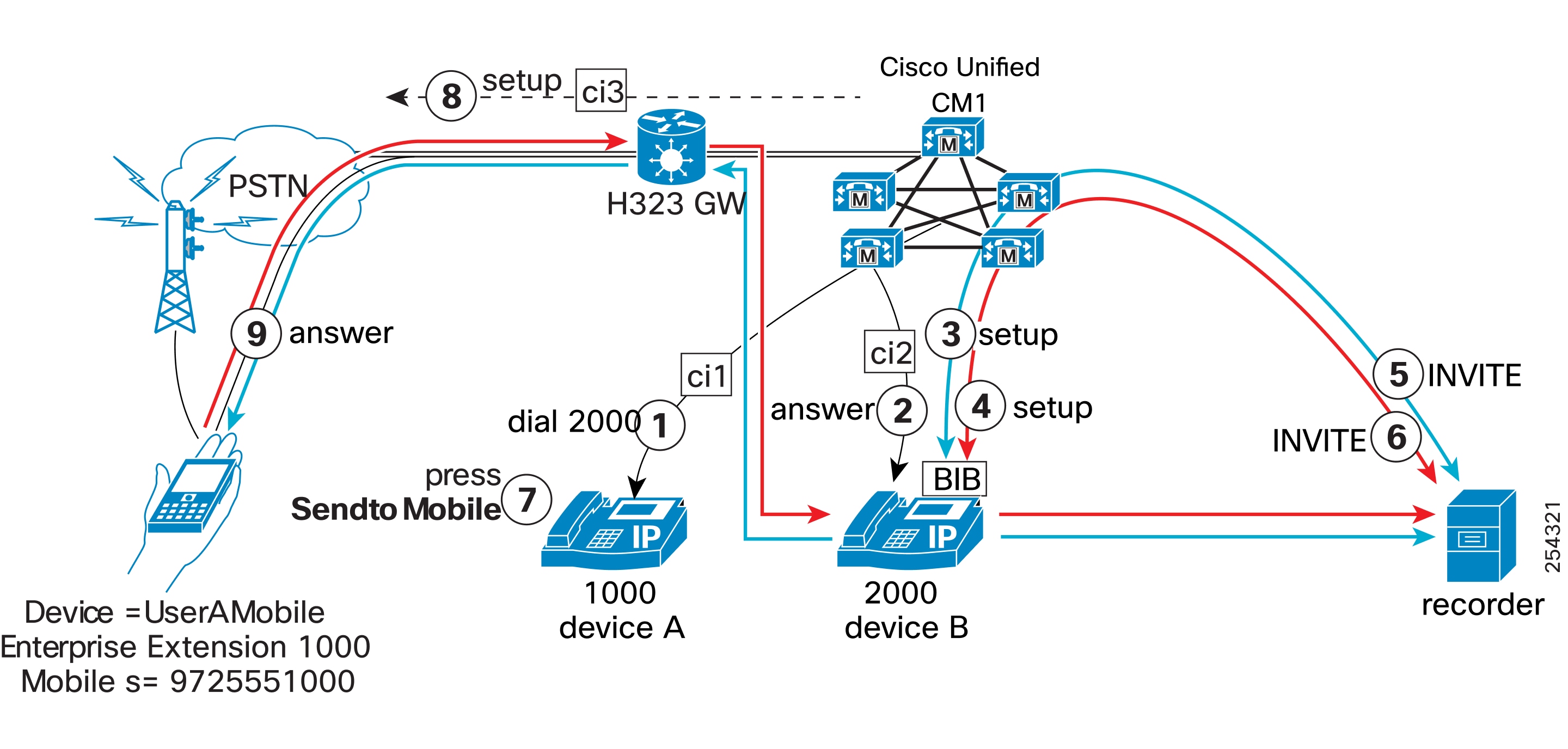 - 5–6. The mobile presses *86 to use DTMF to start the recording session. Cisco Unified Communications Manager selects the ingress gateway to fork the media to the recorder.