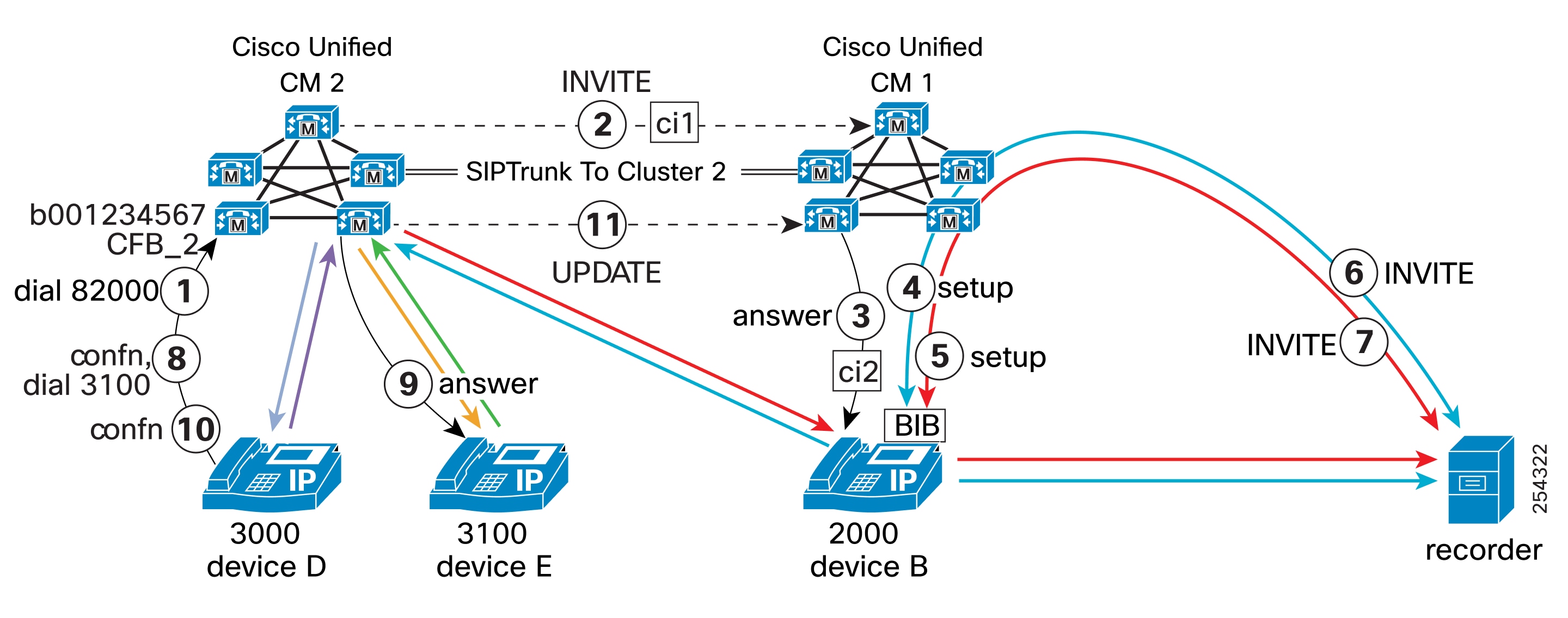 - 7–8. Cisco Unified Communications Manager in Cluster 2 requests that Cluster 1 stop the recording session. Cluster 1 instructs the gateway to stop the session.