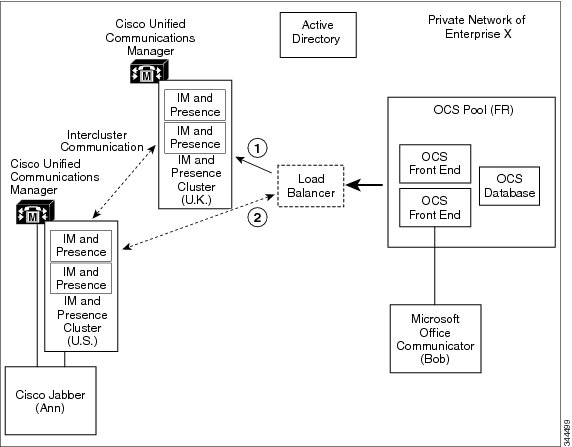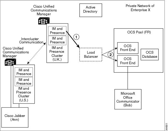 The following figure shows a high-level sample deployment of IM and Presence Service and Microsoft OCS within the same domain. This example shows an OCS deployment, but it also applies to the other supported Microsoft servers.