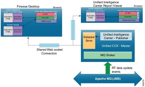 Live Data report in Unified Intelligence Center Report Viewer or through a core permalink - All the Javascript libraries are required to create the Websocket tunnel and the OpenAjaxHub in the browser are loaded as part of the web page. A Websocket tunnel is then created from the client window to the Websocket server, and shared by all the Live Data reports that are run in the client window.