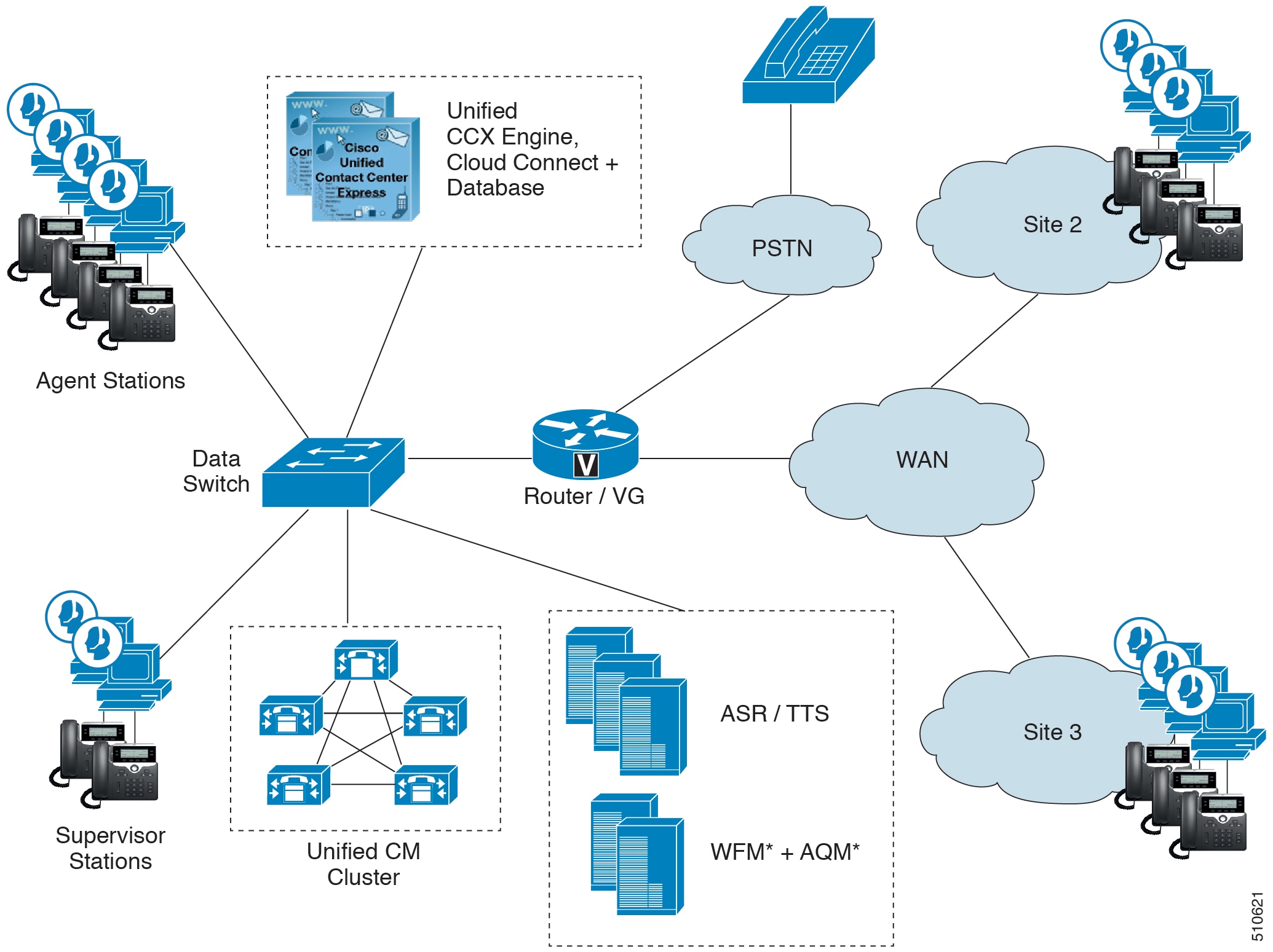 The following figure depicts the deployment when integrating Unified CCX with Unified Communications Manager. In this deployment, optional Unified CCX components shown with an asterisk (*) can be added. These components are: