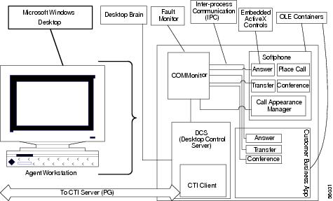 The Softphone Controls are in-process (DLL) ActiveX objects that run in the host container application's process address space. The Softphone Controls communicate with the Desktop Control Server and the host container applications via IPC (InterProcess Communication); the protocol of the IPC is the OLE2 protocol. The Desktop Control Server has CTIClient embedded as an in-process server, which in turn talks over a TCP/IP socket to the CTI Server.