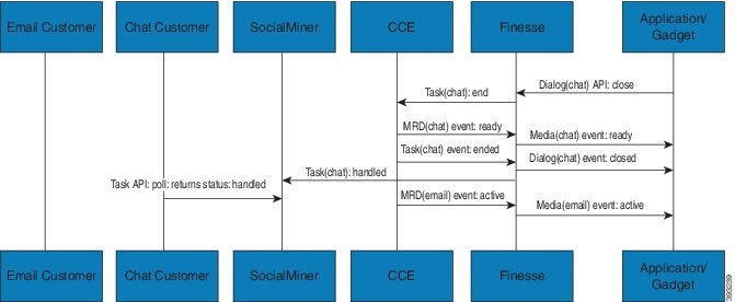 In most cases, SocialMiner social contact states do not map directly to Finesse dialog states. For SocialMiner, social contacts are created when the customer submits a task request. For Finesse, the dialog with which the agent engages with the customer is created when the task is routed to the agent.