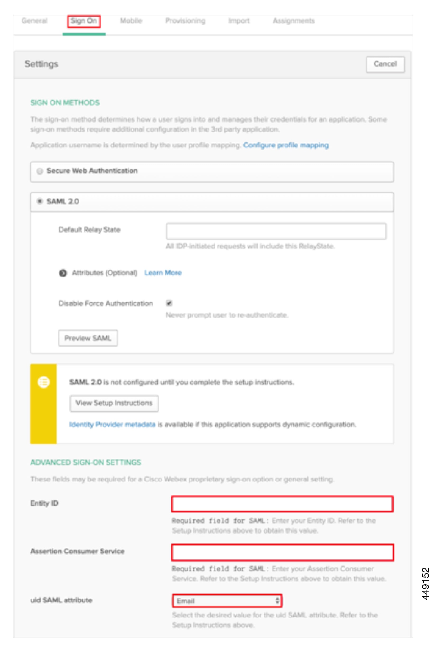 See SSO Configuration for Cisco Webex on On-Premise and MRA with OKTA IdP for SSO configuration examples with OKTA IdP.
