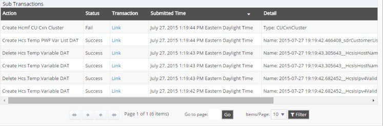 The 'Status' for the transaction indicates the overall status of the entire overbuild. Click the ID of a subtransaction to review its details.