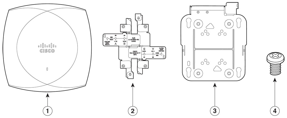 Default mounting brackets: Adjustable ceiling-rail clips AIR-AP-T-RAIL-R= and AIR-AP-BRACKET-1=