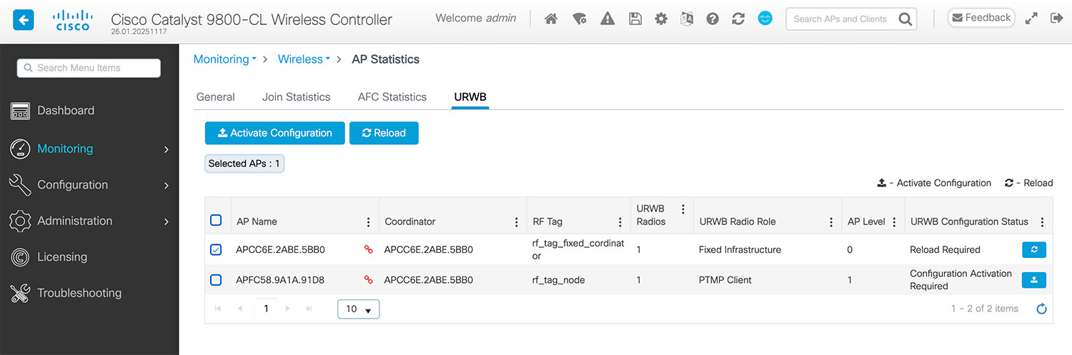 These URWB parameters cannot be changed dynamically. The device must be rebooted for the changes to take effect. You can use either the reload command or use the Reload button in the URWB tab of the Monitoring > Wireless > AP Statistics page.