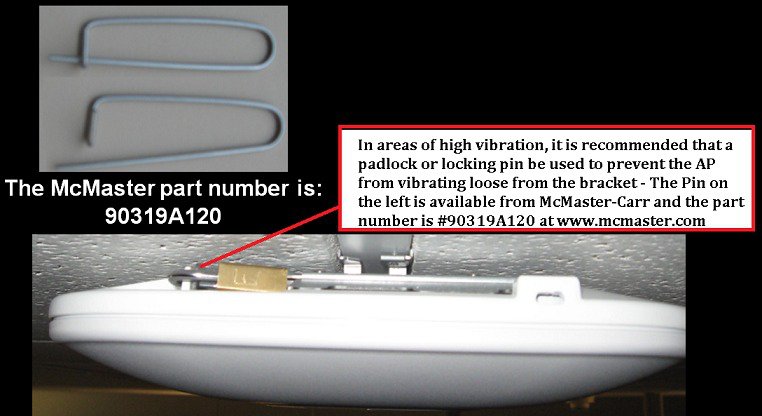 If the access point is installed using a "side arm" type mount or other mounting locations where there is a likelihood of high vibration, it is recommended that a padlock or metal pin be used to prevent the AP from vibrating loose from the bracket.