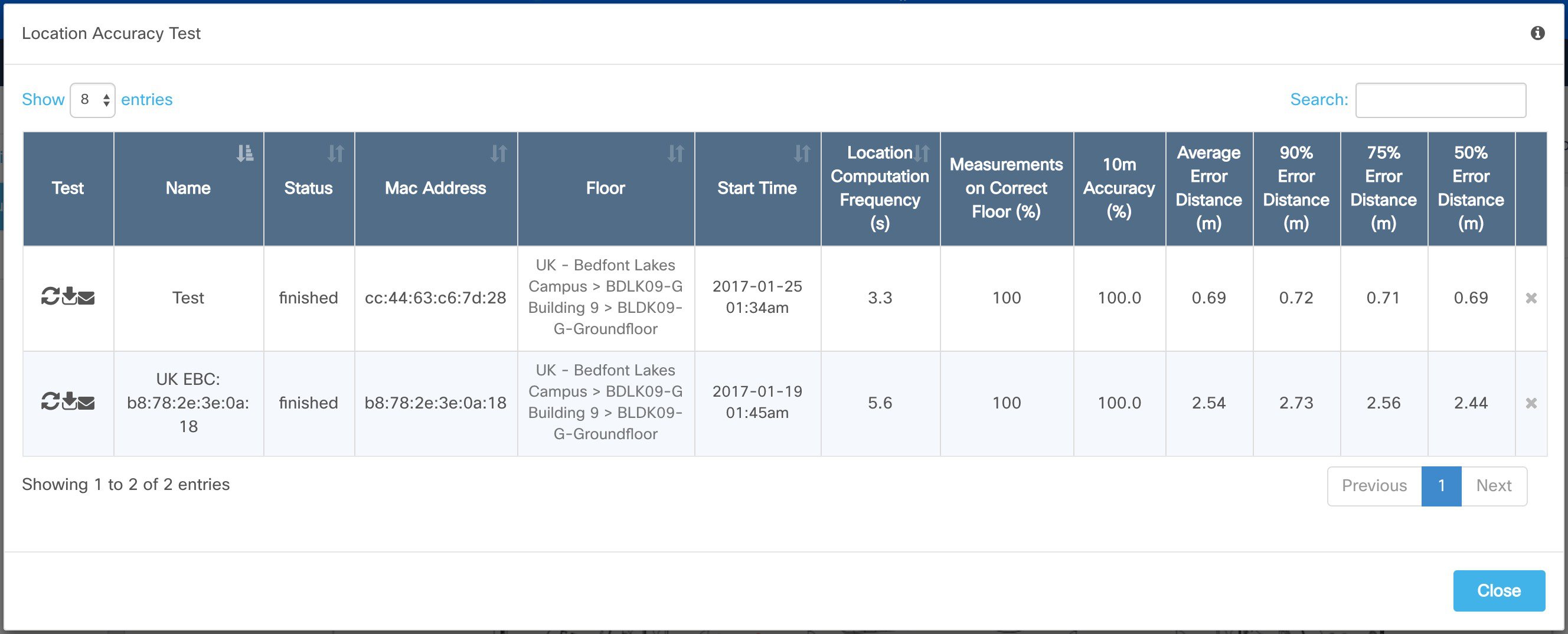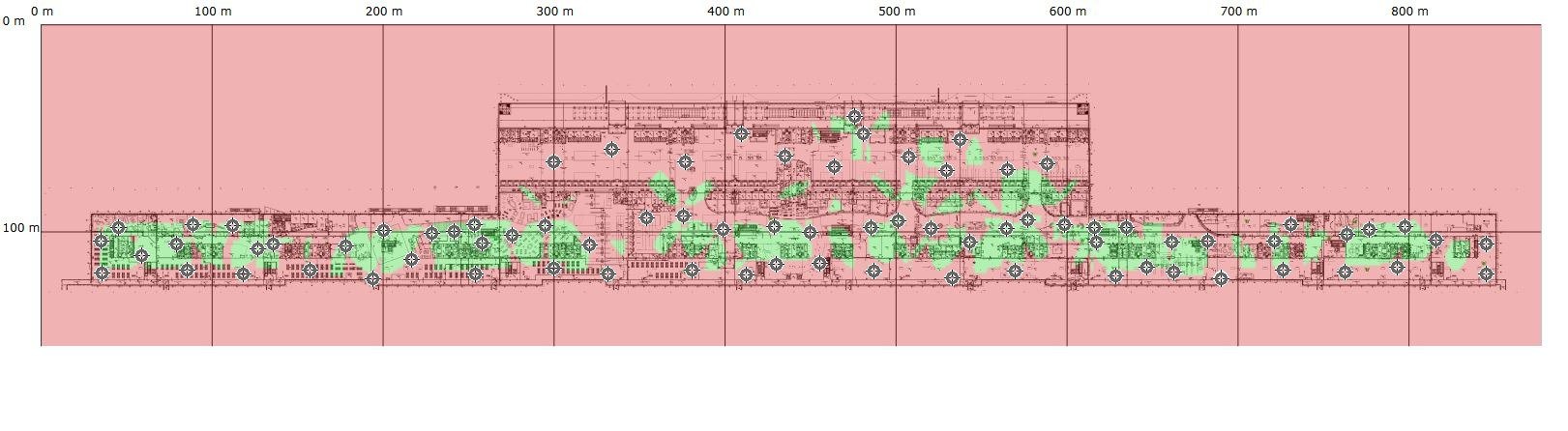 Within Cisco Prime, navigate to the Maps view and run the Location Accuracy Test for each floor. This will produce a heatmap showing an estimate of location suitability. The ideal output is a predominantly green overlay, although a combination of green/orange would also qualify. Examples are shown in above figures.