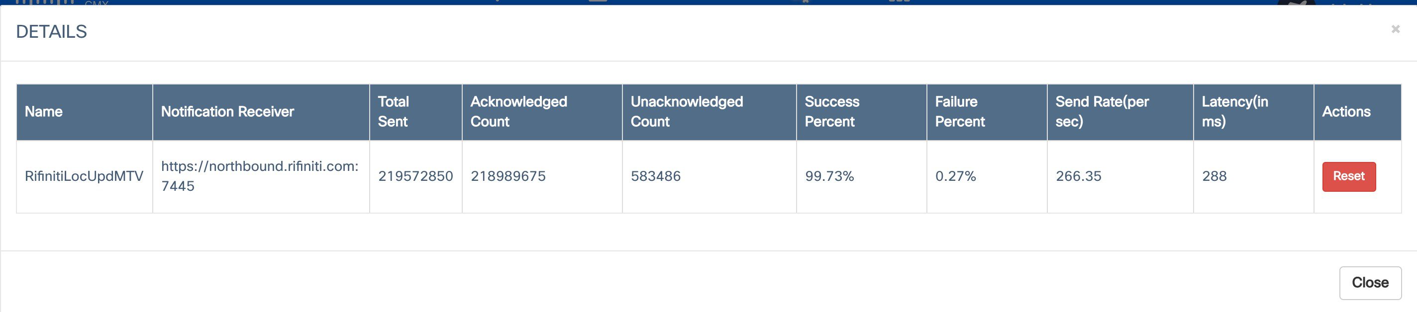 To verify the number of notifications per second, you can select a notification and view the details. The Latency should be less then 1000ms and the Failure Percentage less then 5%. In some cases no notification ACKs are sent, but this does not mean that Optimo is not receiving them.