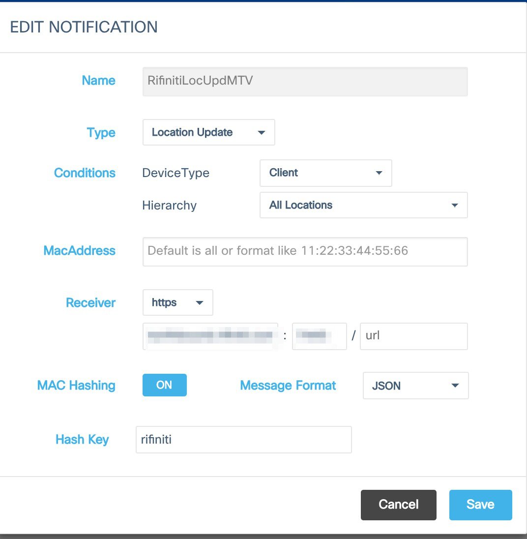 Notification Parameters Destination Location Update Device Type = Client https://DEFINEDBYRIFINITI:PORT The largest amount and most important data that is sent from CMX to rifiniti is the LOCATION UPDATE notification. One important consideration is that all of the notifications from CMX to rifiniti have MAC Hashing enabled and use the same key. This protects all of the privacy of the individuals, but still allows for the aggregation on the information by rifiniti.