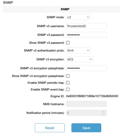 To specify the SNMP v3 encryption passphrase (SNMP v3) |