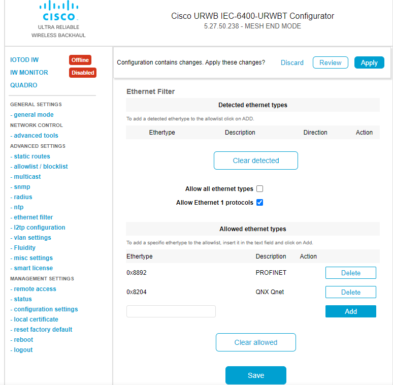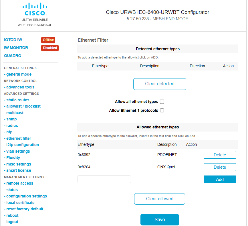From IEC6400 Release 1.1.0, the IEC6400 gateway supports Layer 2 Mesh Transparency feature. Layer 2 mesh transparency feature allows to forward non-IPv4 Layer 2 protocols across the URWB network by selectively filtering which ether-types are permitted. The selection of allowed ether-types can be performed from either the CLI or the GUI.