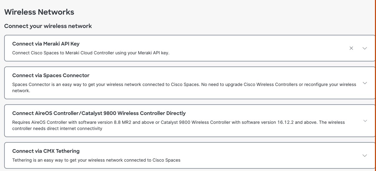 You can set up Cisco Spaces with wireless networks that are based on the following options: