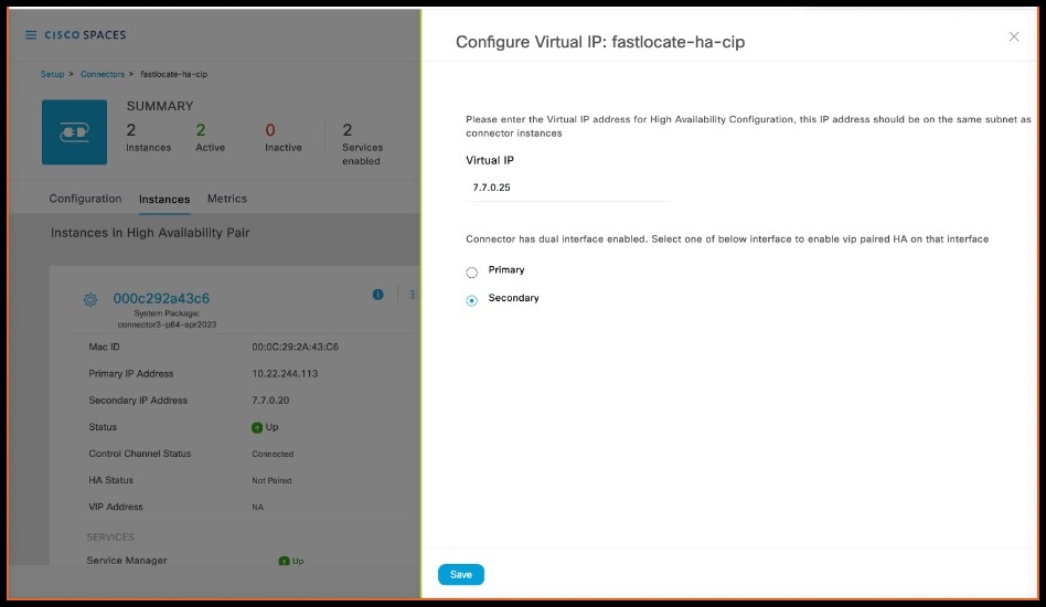 On the Cisco Spaces dashboard, go back to the connector details page, and click the Instances tab. Here, you can see both the connectors that you configured. Observe that the connector IP addresses are reflected here.