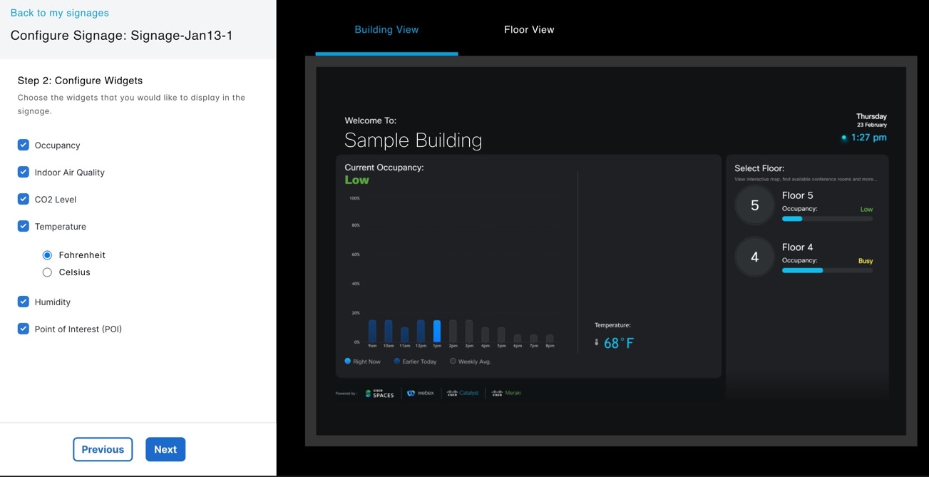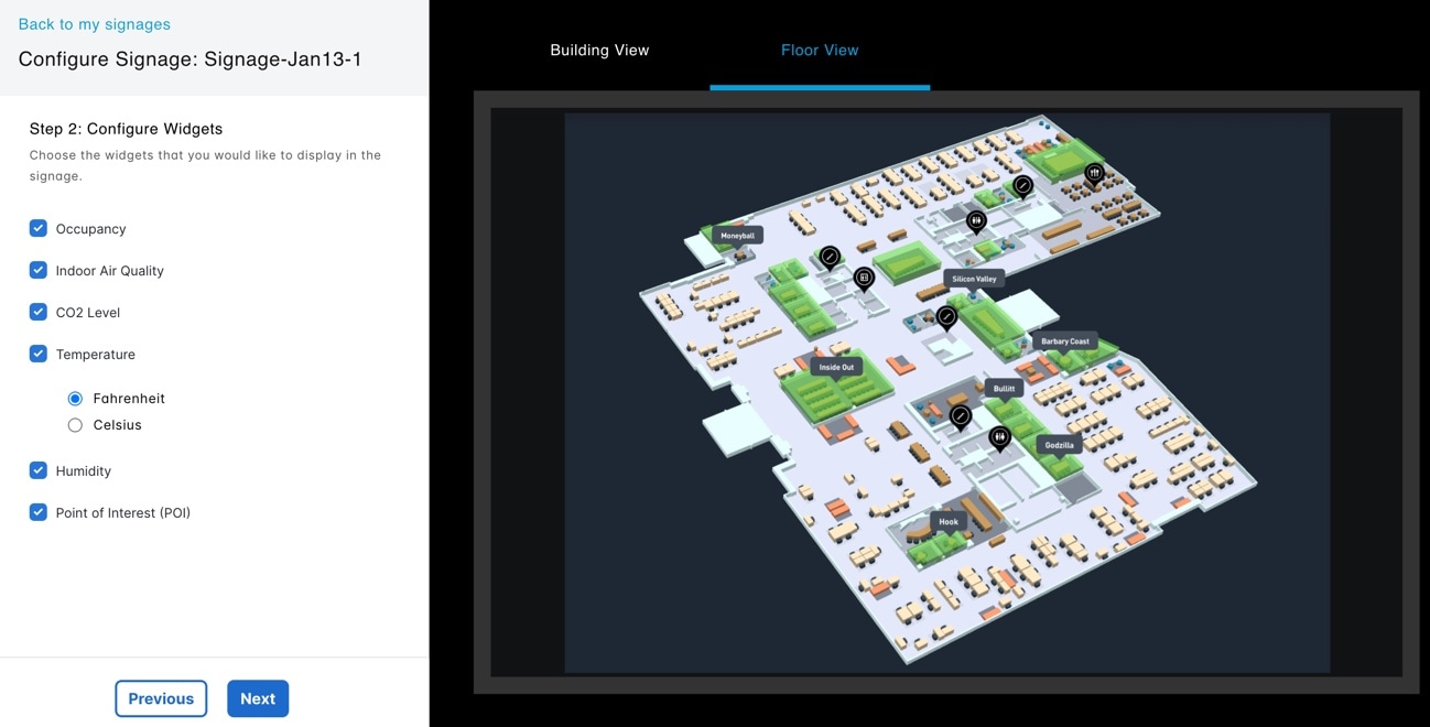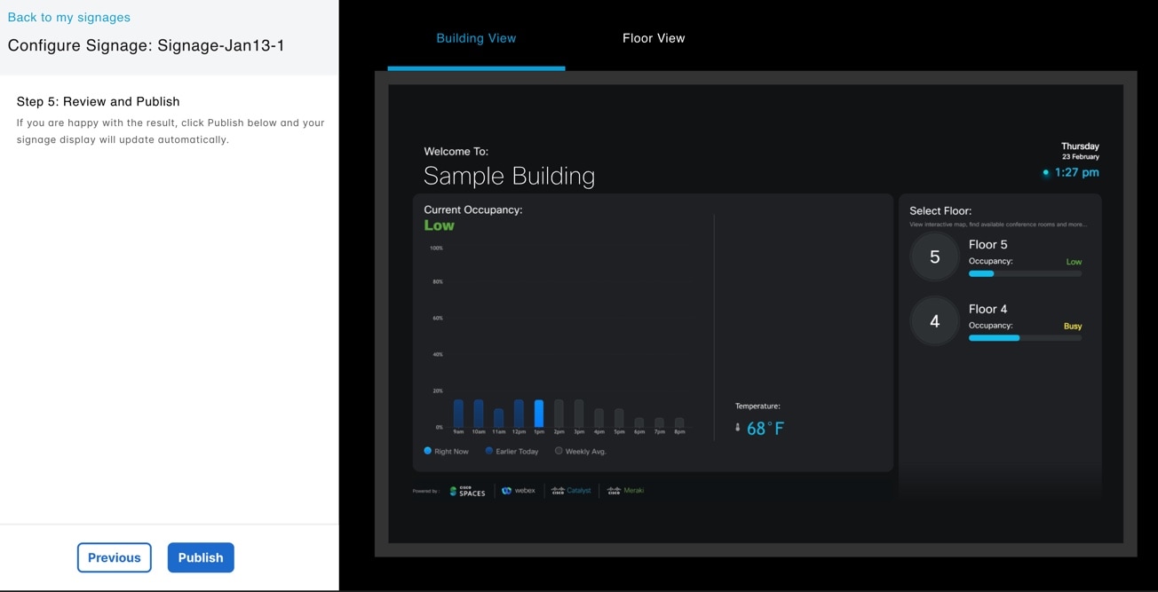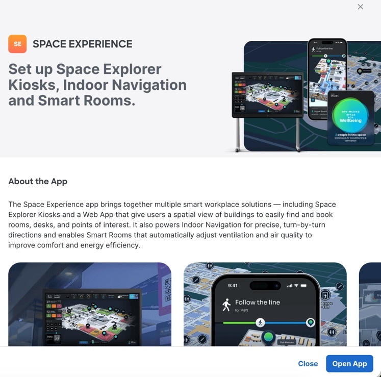 The Space Experience app enables you to onboard, configure, and manage digital signages across meeting rooms, floors, and buildings in the workplace using Cisco Spaces.