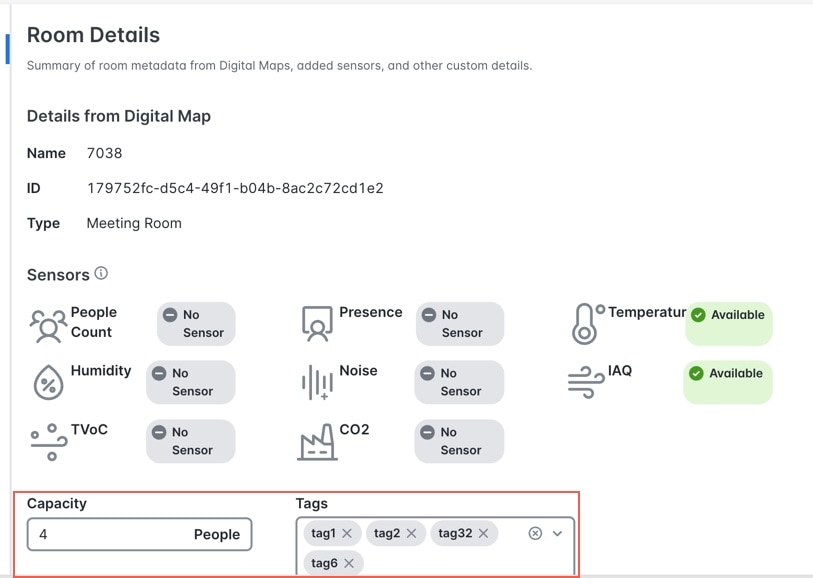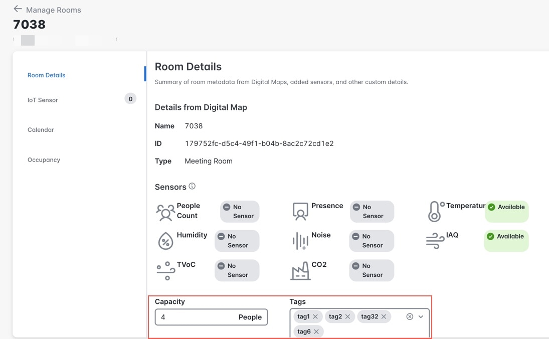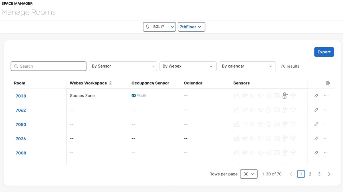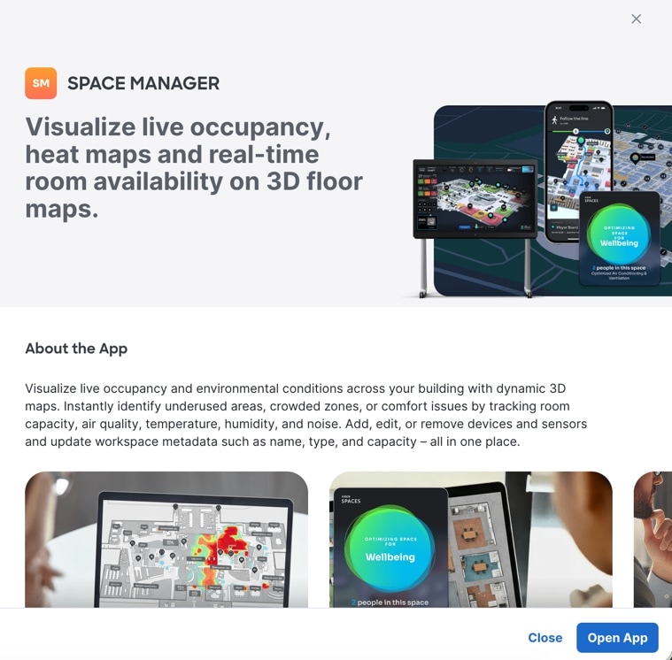The Space Manager app enables facility managers to configure integrated devices such as Cisco Meraki and Cisco IoT devices and sensors in your workspace to provide access to real-time occupancy data like meeting room capacity and availability.