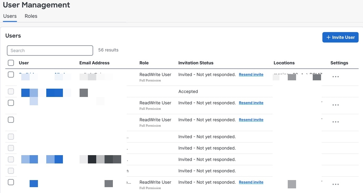 In the User Management section, you can view a listing of all Space Manager users and their assigned roles. You also have the option to invite users to a specific campus, Meraki Org, building or network.