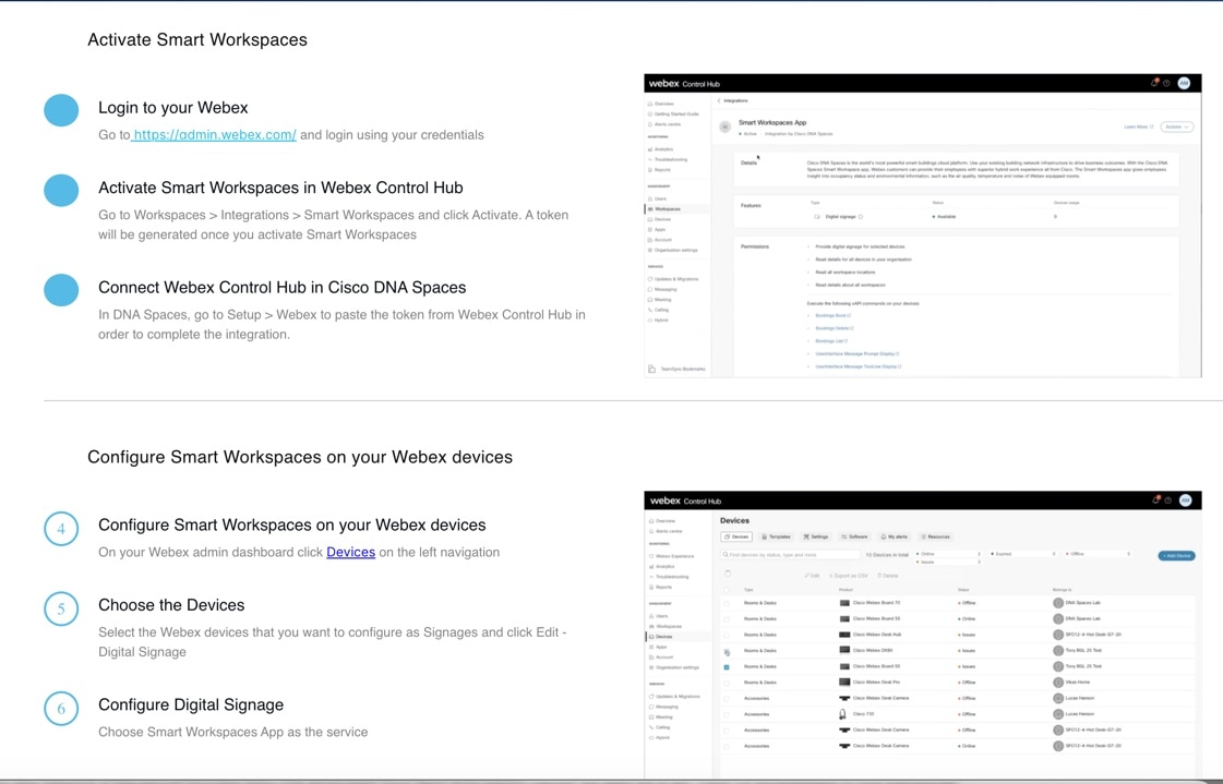 To get started with Space Experience, you need to connect your Webex Control Hub account, then configure Smart Workspaces signage.