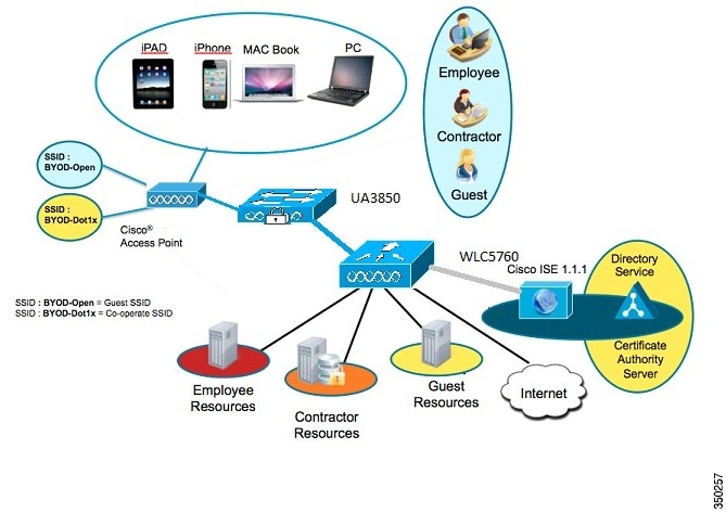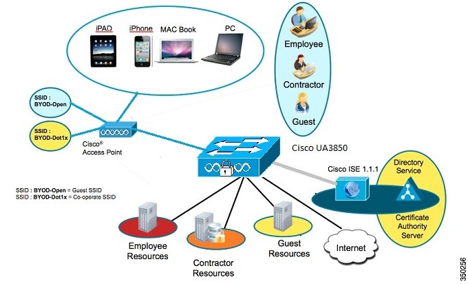 In this use case, there is a single SSID (BYOD-Dot1x) for corporate access that is authenticated and authorized with both Protected Extensible Authentication Protocol (PEAP) and Extensible Authentication Protocol Transport Layer Security (EAP-TLS).