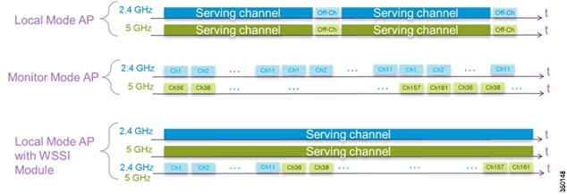A Cisco 3600 series Access point with the WSSI module uses a combination of "on-channel" and "off-channel". This means that the AP3600 2.4GHz and 5GHz will scan the channel that they are serving clients and the WSSI module would operate in monitor mode and scan all channels.