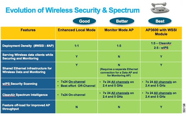 Wireless Security and Spectrum Intelligence (WSSI) Module - This is an add-on module to the Cisco Aironet 3600 Series Access Point, which offloads the constant channel scanning with attack detection and forensics capabilities to the module, freeing up the serving radios for clients