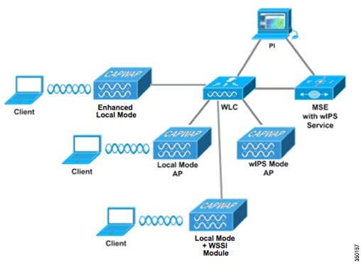 Prime Infrastructure - Provides the administrator the means to configure the wIPS Service on the MSE, push wIPS configurations to the controller and set Access Points into wIPS Monitor mode. It is also used for viewing wIPS alarms, forensics, reporting and accessing the attack encyclopedia.