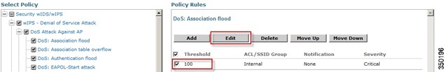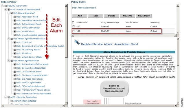 The policy rule window allows the severity of the alarm to be modified in addition to a number of other parameters. The notification item is a check box which defines whether forensic (packet captures) are taken for this particular alarm. There is also a specific threshold for this alarm, which in this case is defined as the number of active associations but this is different for every alarm. Next, the type parameter defines what WLAN infrastructure the system will monitor attacks against. By default this is configured to Device Group and Internal which specifies all APs in the same `RF Group' name as the wIPS APs. Changing the type to SSID allows the system to monitor a separate network, which is typical of an overlay deployment and this configuration is discussed below.