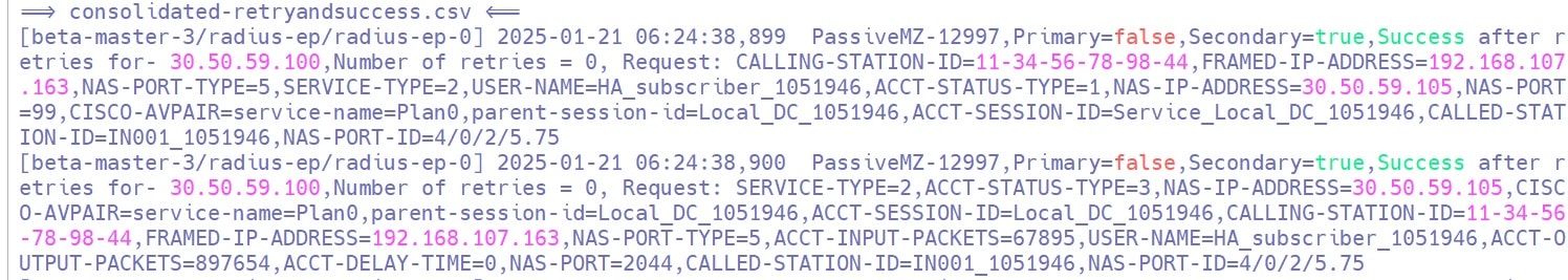 Log for Success on Secondary After Primary Fails: The system generates a log entry in ocs_consolidated-retryandsuccess.csv, pmz_consolidated-retryandsuccess.csv when an accounting message fails to reach the primary, but reaches the secondary OCS or PMZ server after all retries.