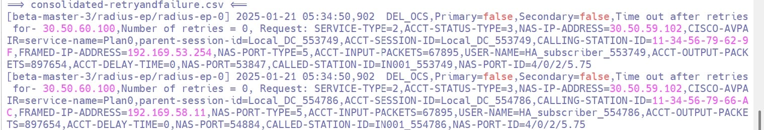 Log for Failure After All Retries: The system generates a log entry in ocs_consolidated-retryandfailure.csv, pmz_consolidated-retryandfailure.csv when an accounting message fails to reach both primary and secondary OCS or PMZ servers after all retries.