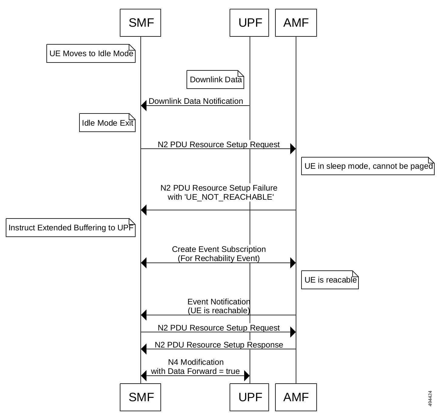 UE's exit from the Idle mode: SMF sends an N1 N2 Transfer Request to AMF. SMF sets the extBufSupport IE (Extended Buffering Support) to true in the N2 PDU Setup Request message to indicate extended buffering support to AMF based on configuration and based on the UPF support.