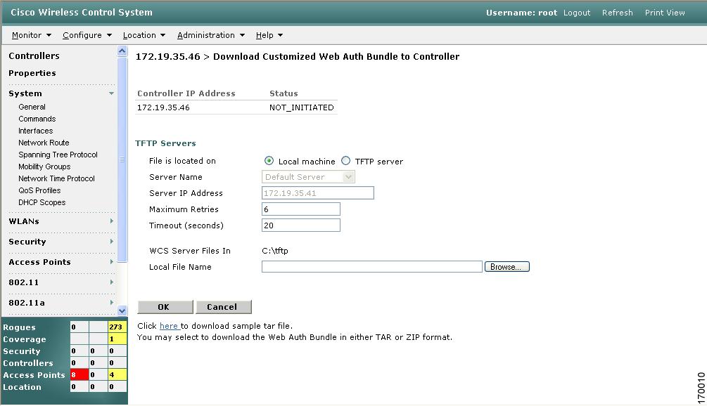 The Download Customized Web Auth Bundle to Controller window appears. The IP address of the controller to receive the bundle and the current status are displayed (see Figure 8-18).