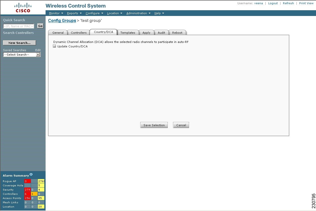 Click the Country/DCA tab. The Country/DCA window appears (see Figure 8-13). Dynamic Channel Allocation (DCA) automatically selects a reasonably good channel allocation amongst a set of managed devices connected to the controller.