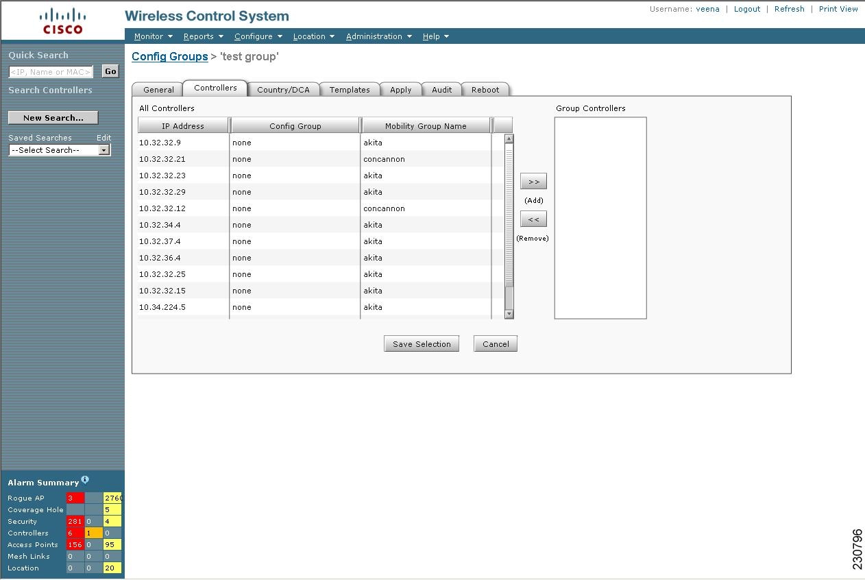 Click the Controllers tab. The columns in the table display the IP address of the controller, the config group name the controller belongs to, and the controller's mobility group name.
