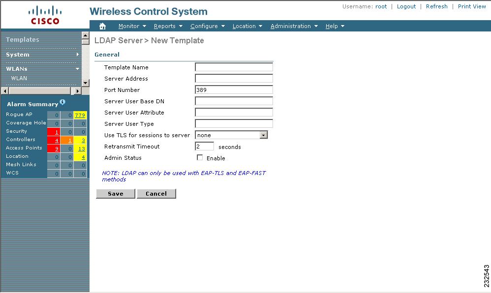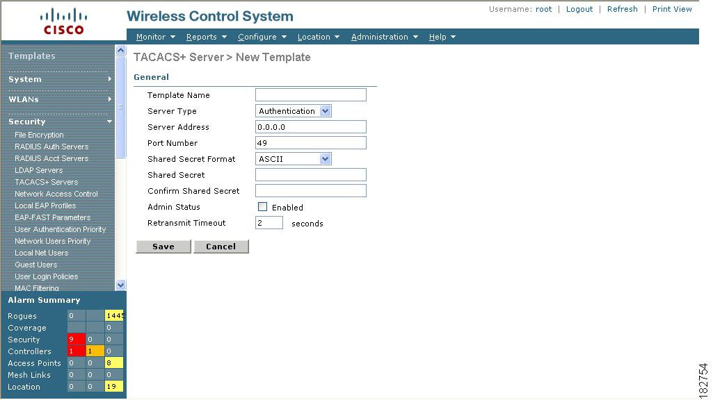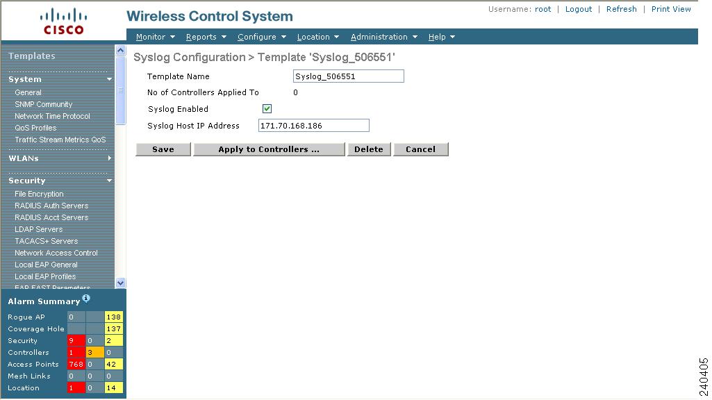 Step 3 To add a new template, choose Add Template from the Select a command drop-down menu and click GO. To make modifications to an existing template, click to select a template in the Template Name column. The Syslog Configuration Template window appears (see Figure 10-51), and the number of controllers the template is applied to automatically populates.