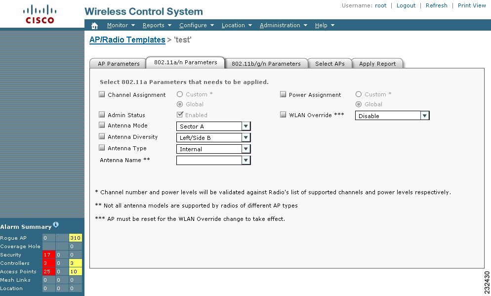 Step 3 Choose the 802.11a/n Parameters or 802.11b/g/n Parameter tab. The AP/Radio Templates window appears (see Figure 10-55).