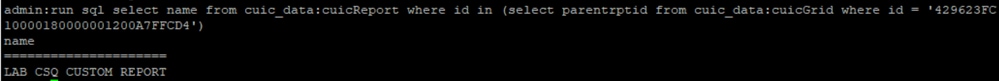 Ejecute SQL, elija el nombre de cuic_data:cuicReport donde id(seleccione parentrptid de cuic_data:cuicGrid donde id = '<viewId copiado de la respuesta de error>').