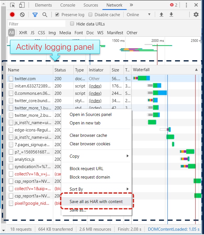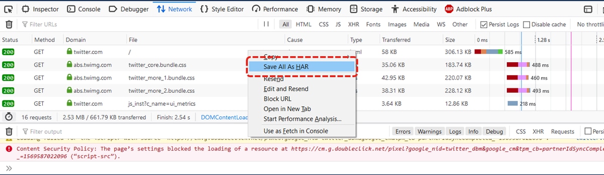 5. Una vez que se haya vuelto a crear el problema, haga clic con el botón derecho en el panel de actividad y seleccione Guardar todo como HAR como se muestra en la imagen.